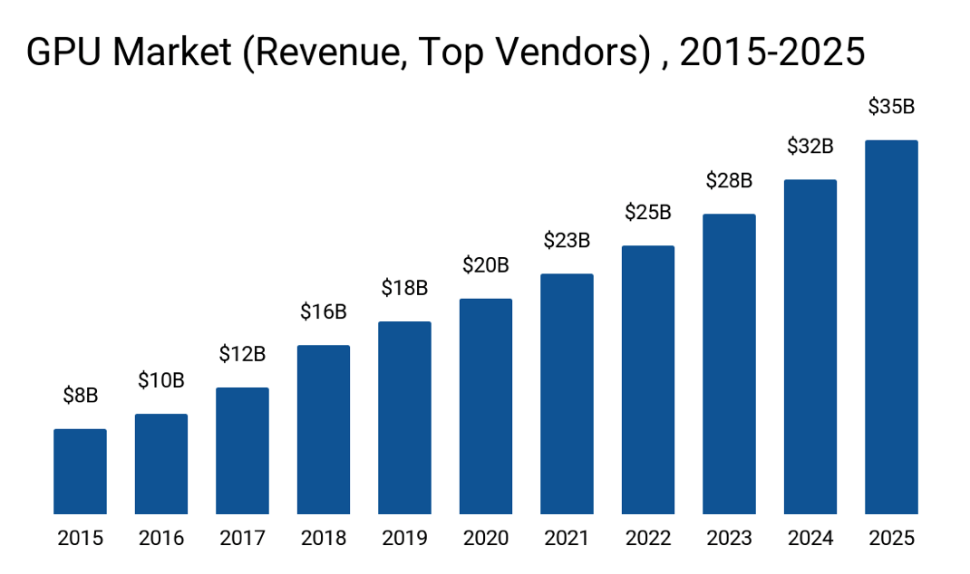 Thanks to the increasing industry demand and the gradual penetration of new fields, the GPU market has been growing steadily. According to the data, the GPU industry will be $20 billion in 2020. From 2015 to 2025, the GPU industry is expected to grow at an average of 13% per year, expanding from $8 billion to $35 billion in size.